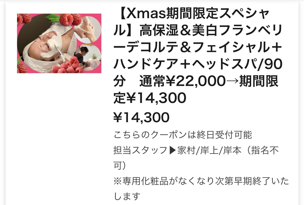 • フランベリーの心地よい香りに包まれながら、筋肉へのアプローチも加えたリラックス効果の高いハンドテクニックが特徴の一つです。【デコルテ〜首〜顔+冬の乾燥して荒れやすいハンドケア+リラックス効果の高いヘッドスパ】