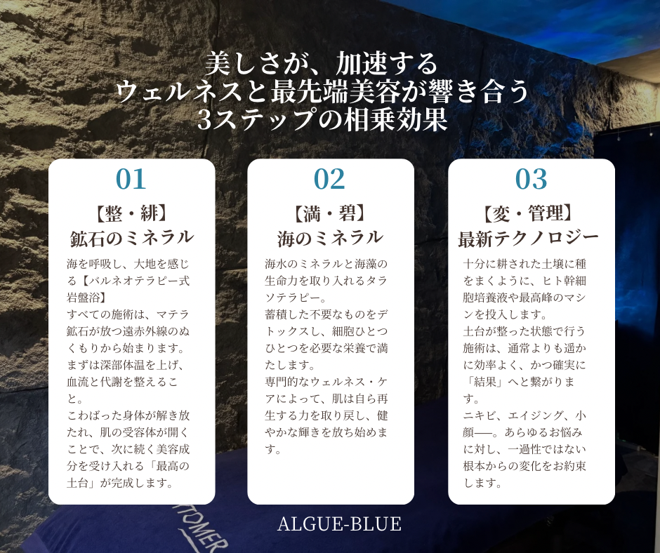 アルグブルーは、マテラ鉱石岩盤浴で深部を温め、タラソテラピーで細胞にミネラルを補給することから始まります。